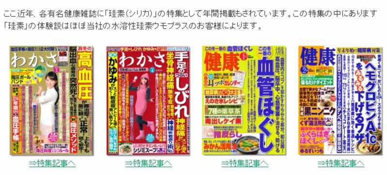「水溶性珪素濃縮溶液 ウモプラス」2013年には製品と同時に製品販売の良質さも認められ日本珪素医科学学会の「推奨品」にも水溶性珪素ウモプラスは選ばれました。ここ近年、各有名健康雑誌に「珪素(シリカ)」の特集として年間掲載もされています。